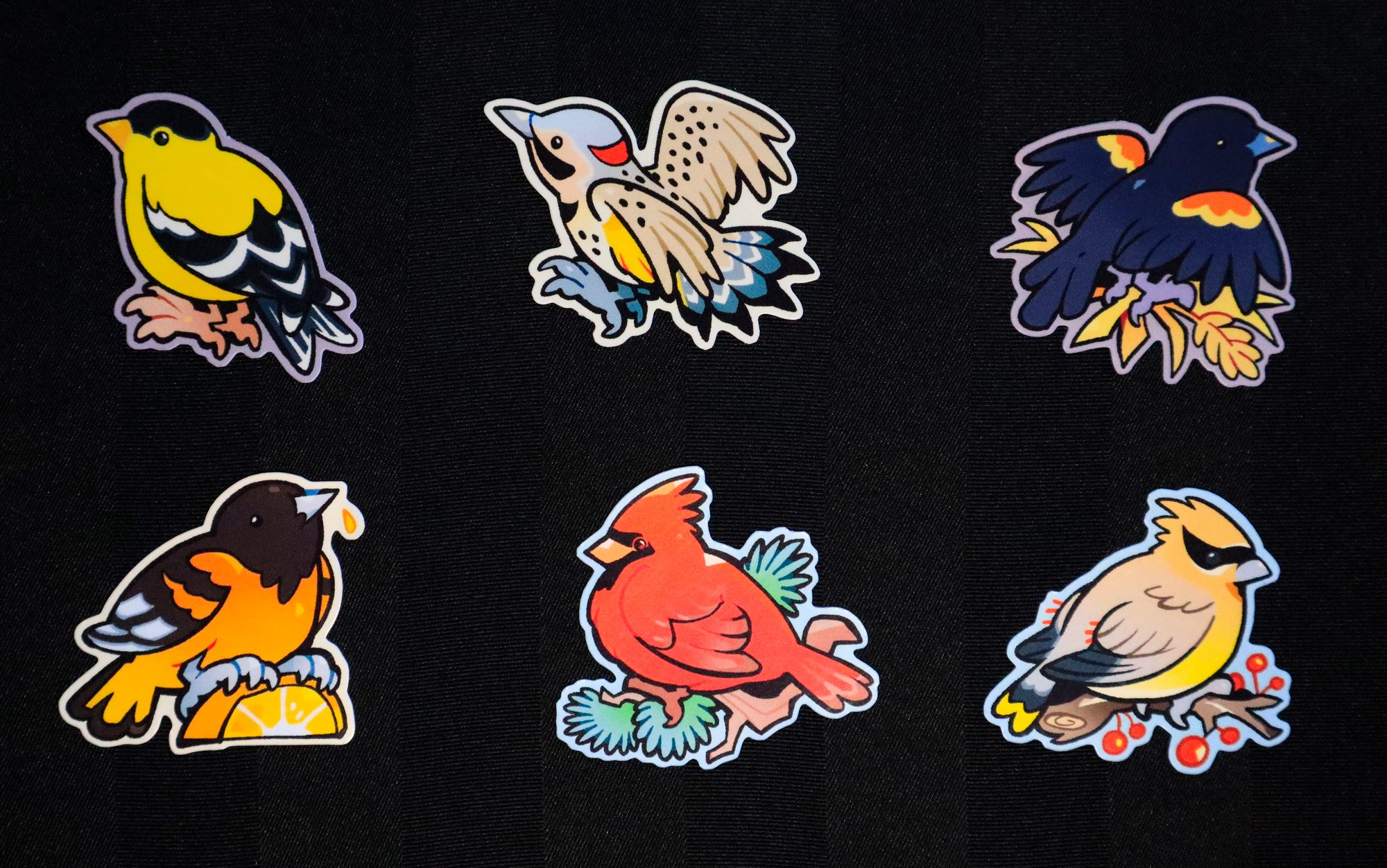 ~2" glossy laminated stickers featuring several famous eastern Canadian backyard birds.